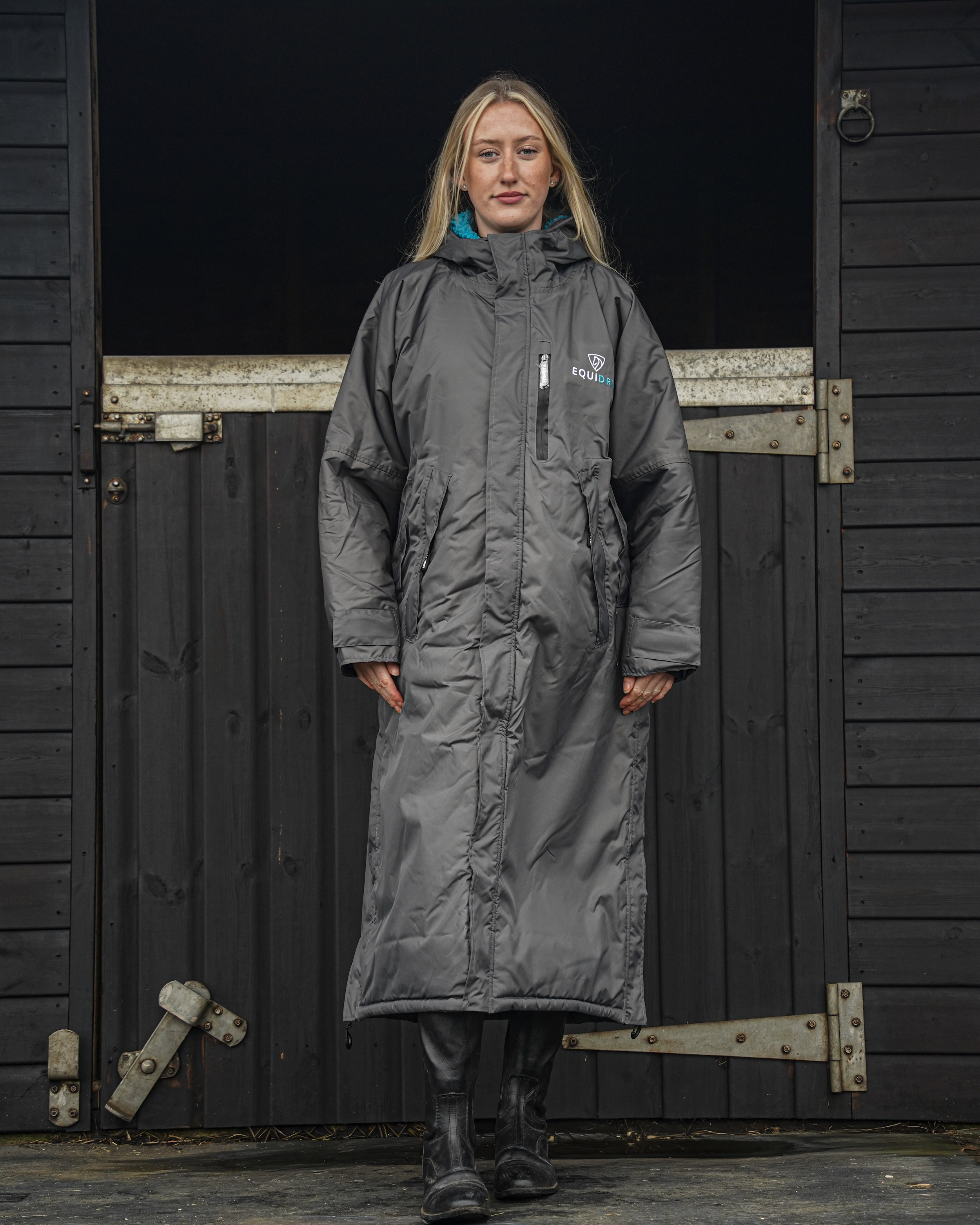EQUIDRY women's long waterproof horse riding coat in charcoal/turquoise EQUIDRY women's long waterproof horse riding coat in charcoal/turquoise