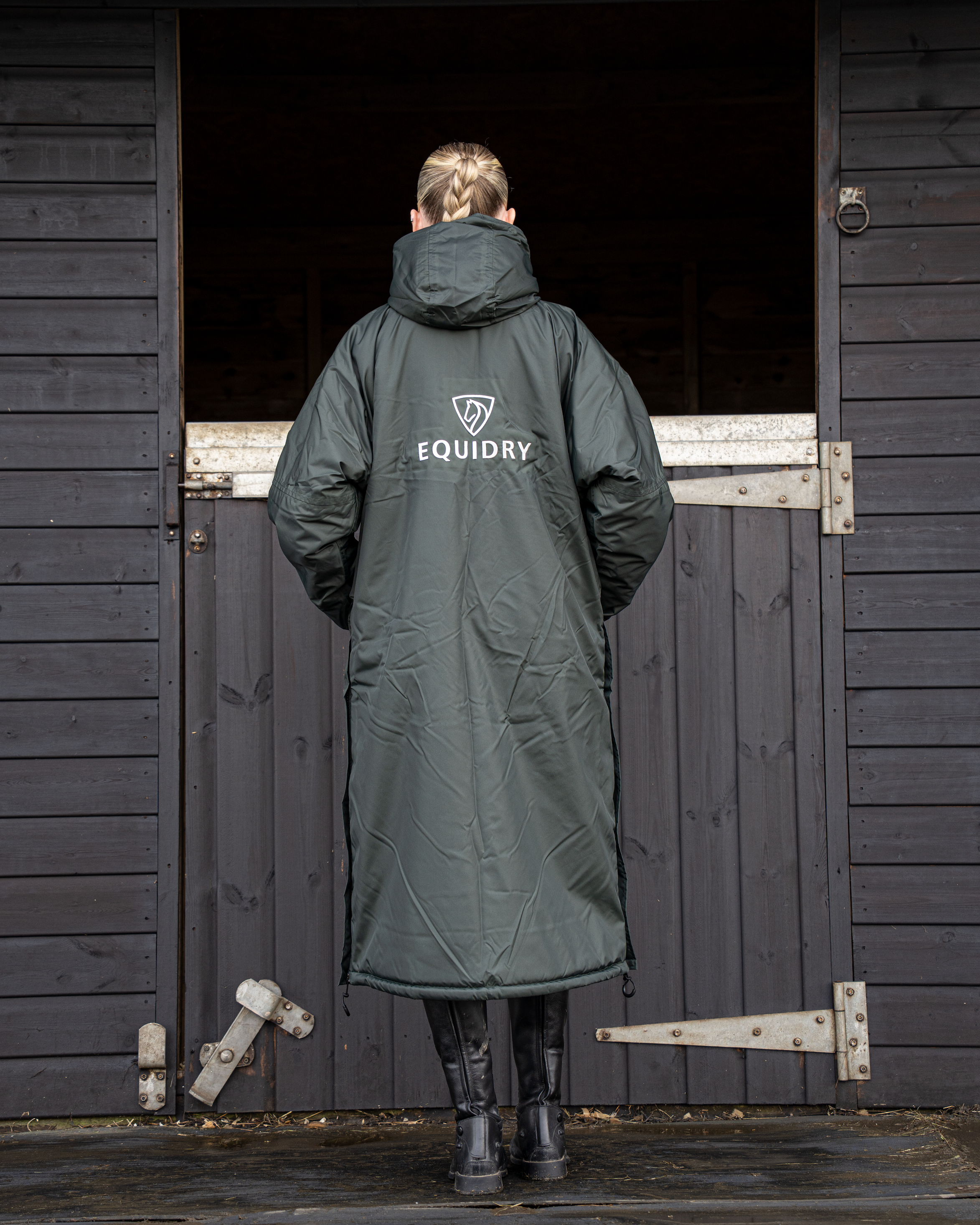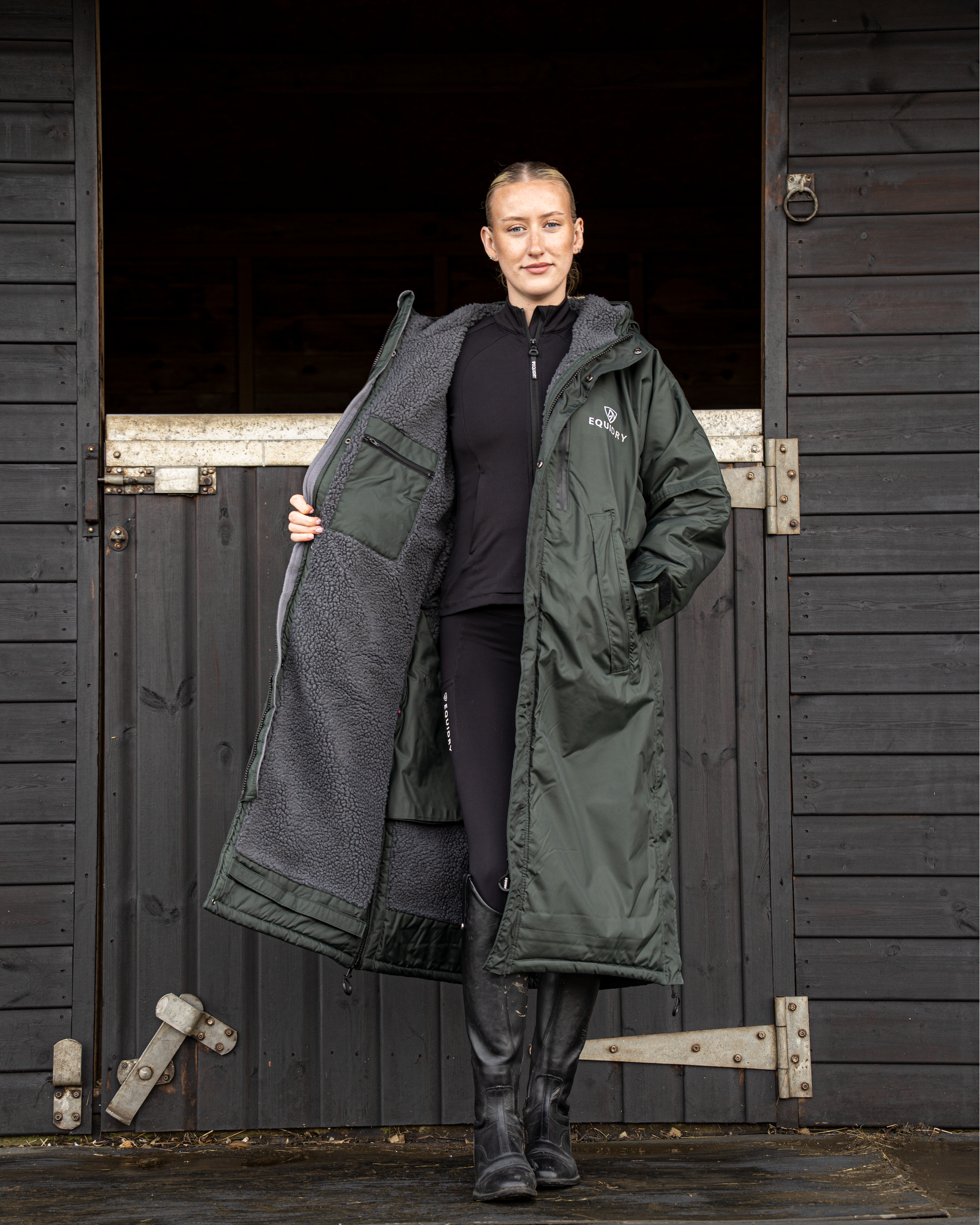 Designed to be oversized and worn full length, this performance coat boasts a remarkable 20,000mm waterproof rating, is fully breathable, fleece-lined, and layer-friendly, allowing plenty of room to comfortably accommodate a body protector.
