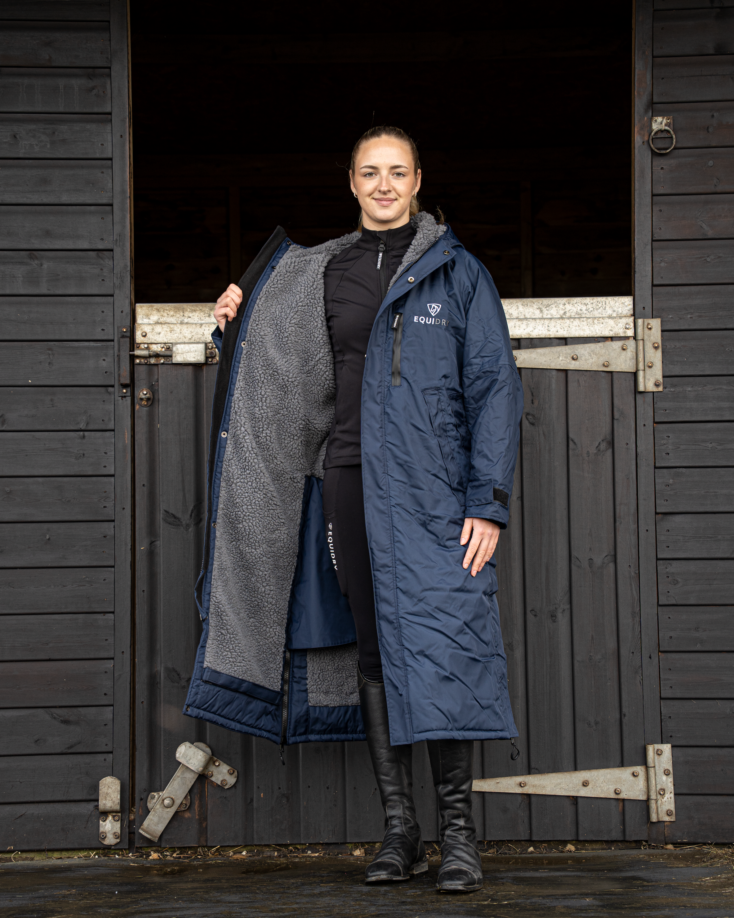 EQUIDRY women's long waterproof horse riding coat in navy/charcoal modelled by rider with horse EQUIDRY women's long waterproof horse riding coat in navy/charcoal modelled by rider with horse