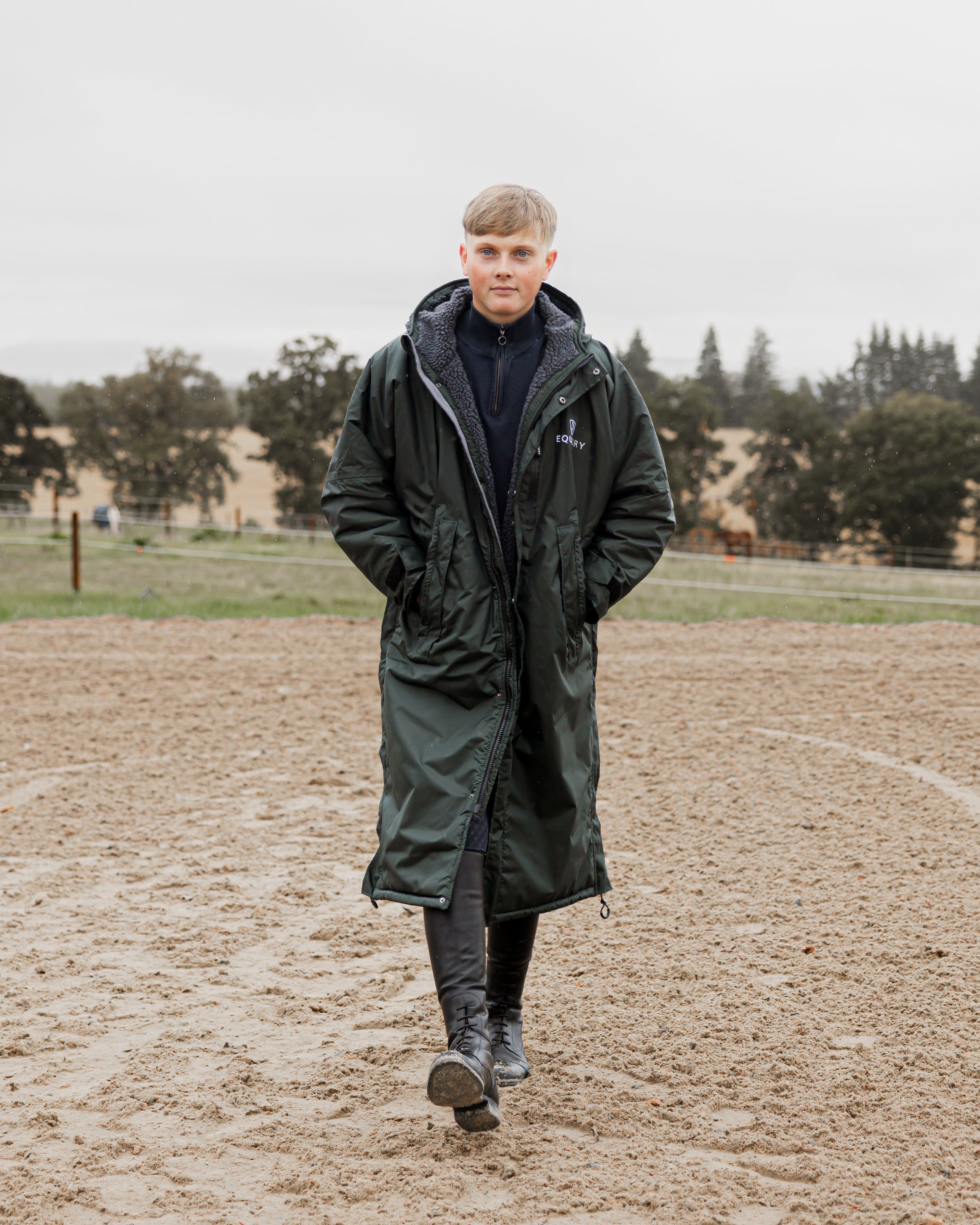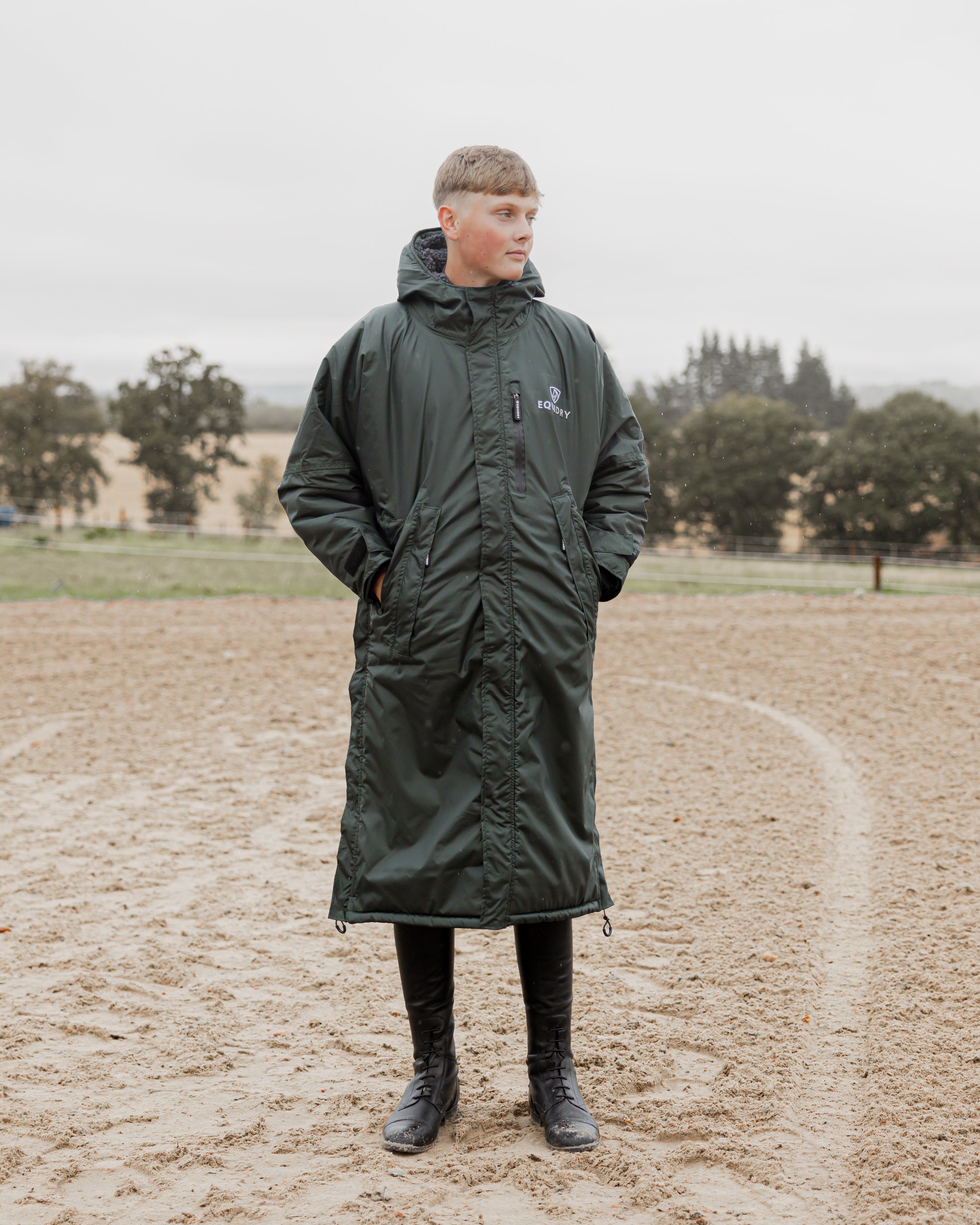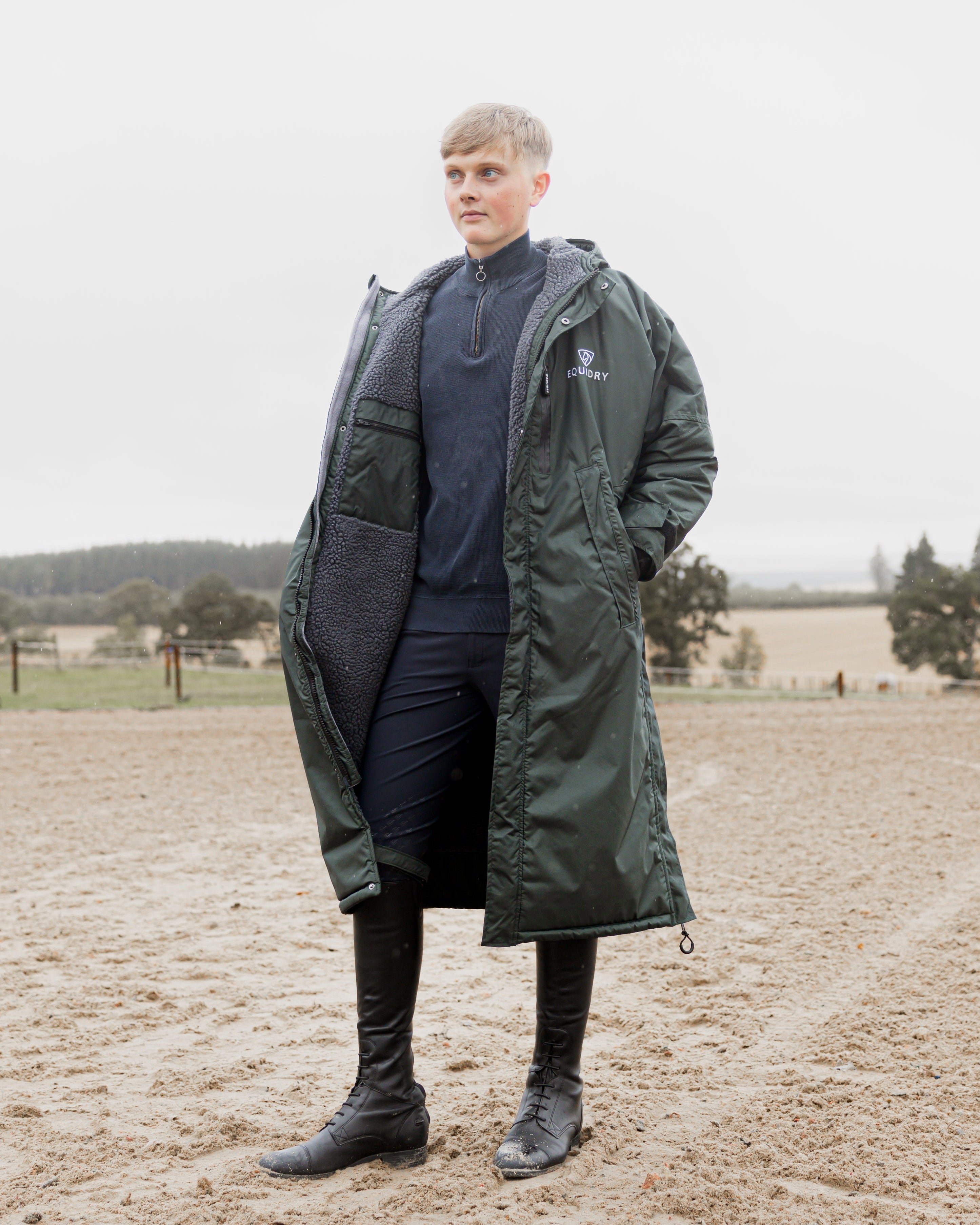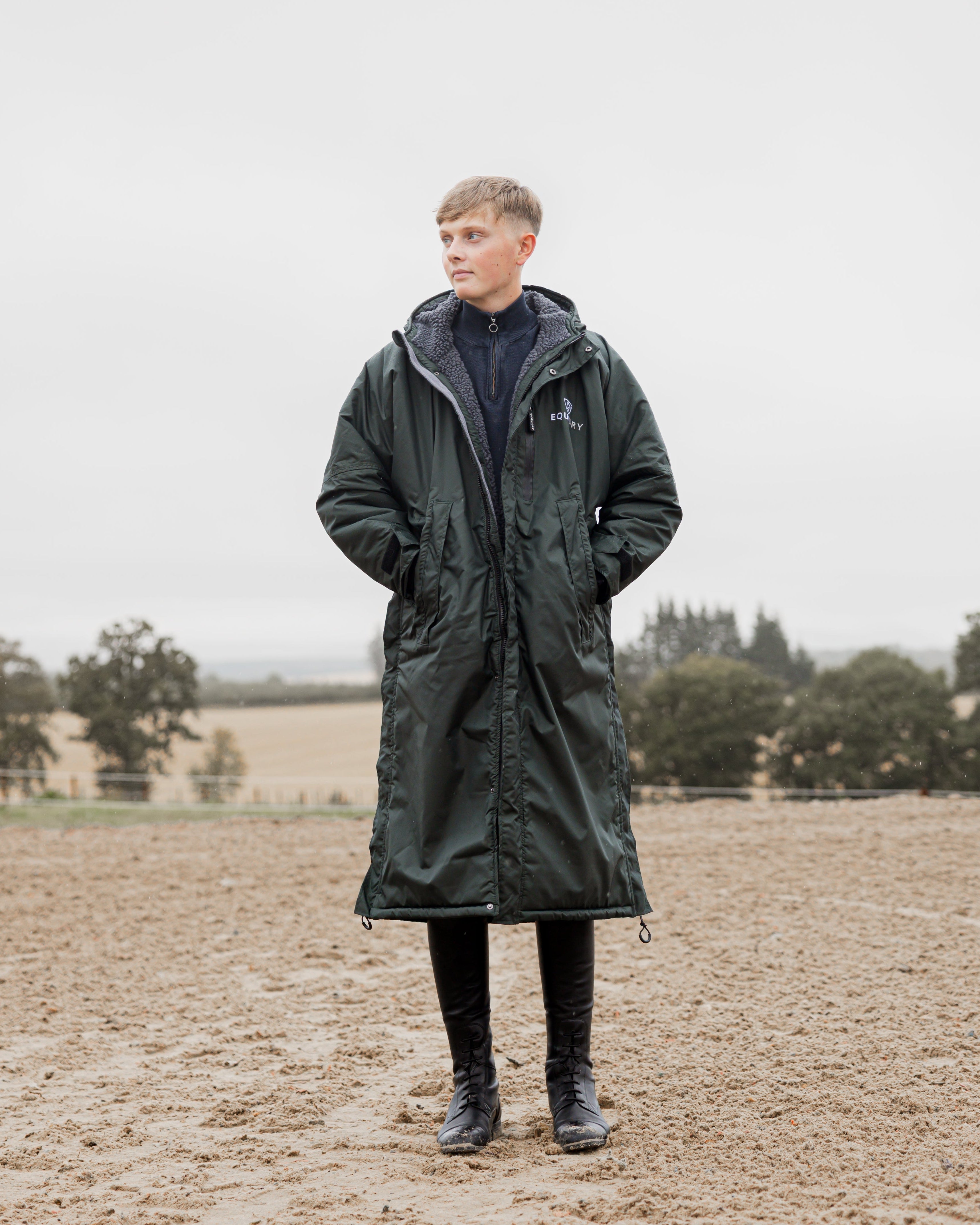 Designed to be oversized and worn full length, this performance coat boasts a remarkable 20,000mm waterproof rating, is fully breathable, fleece-lined, and layer-friendly, allowing plenty of room to comfortably accommodate a body protector.