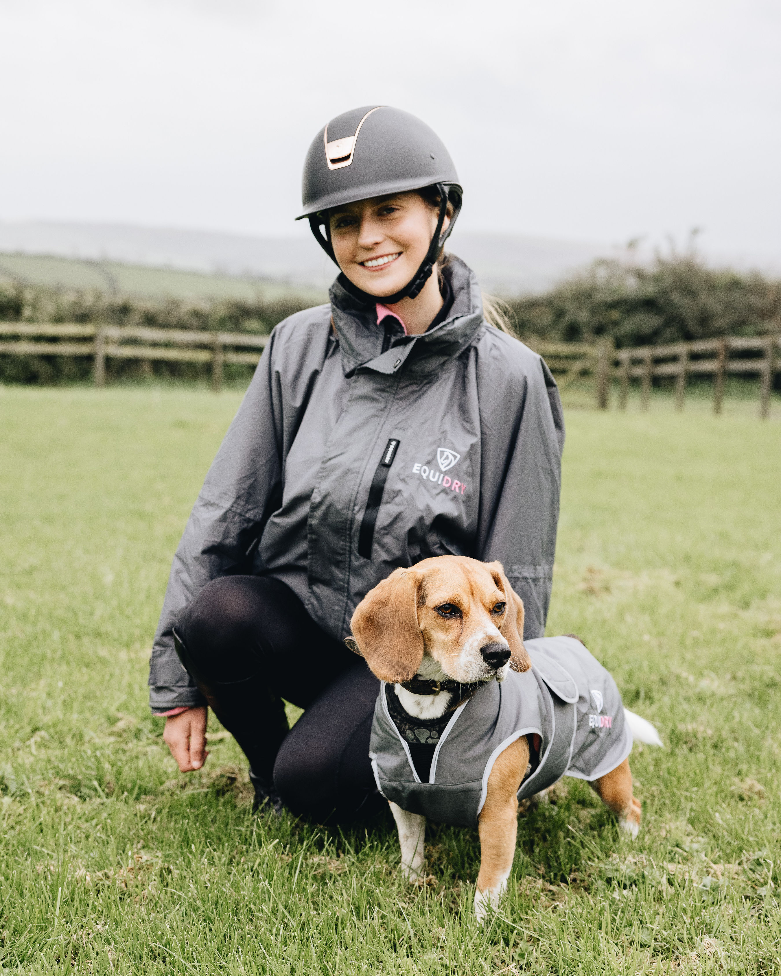 EQUIDRY Waterproof Dog Coat with soft, thin fleece lining, reflective logos & trim with lead and harness access, with an adjustable body band for chest coverage.