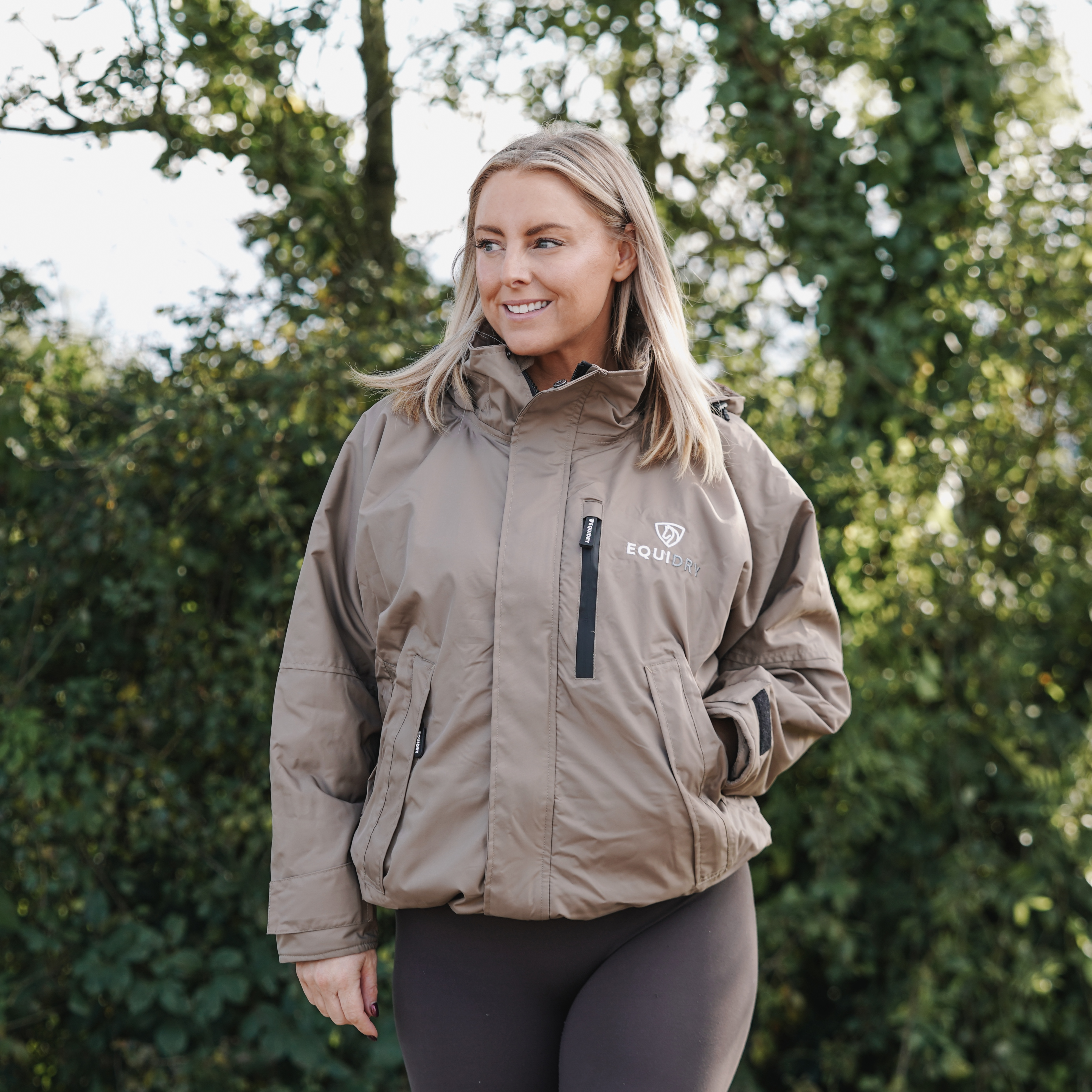 A practical jacket that guarantees to keep you dry with all the room and durability of our much-loved oversized coats. The shortie has hand warmer pockets, multiple zip close pockets and an adjustable bungee hem along with a large hood that will fit over a riding helmet or fold away neatly into the neck for a smart, high collar look.