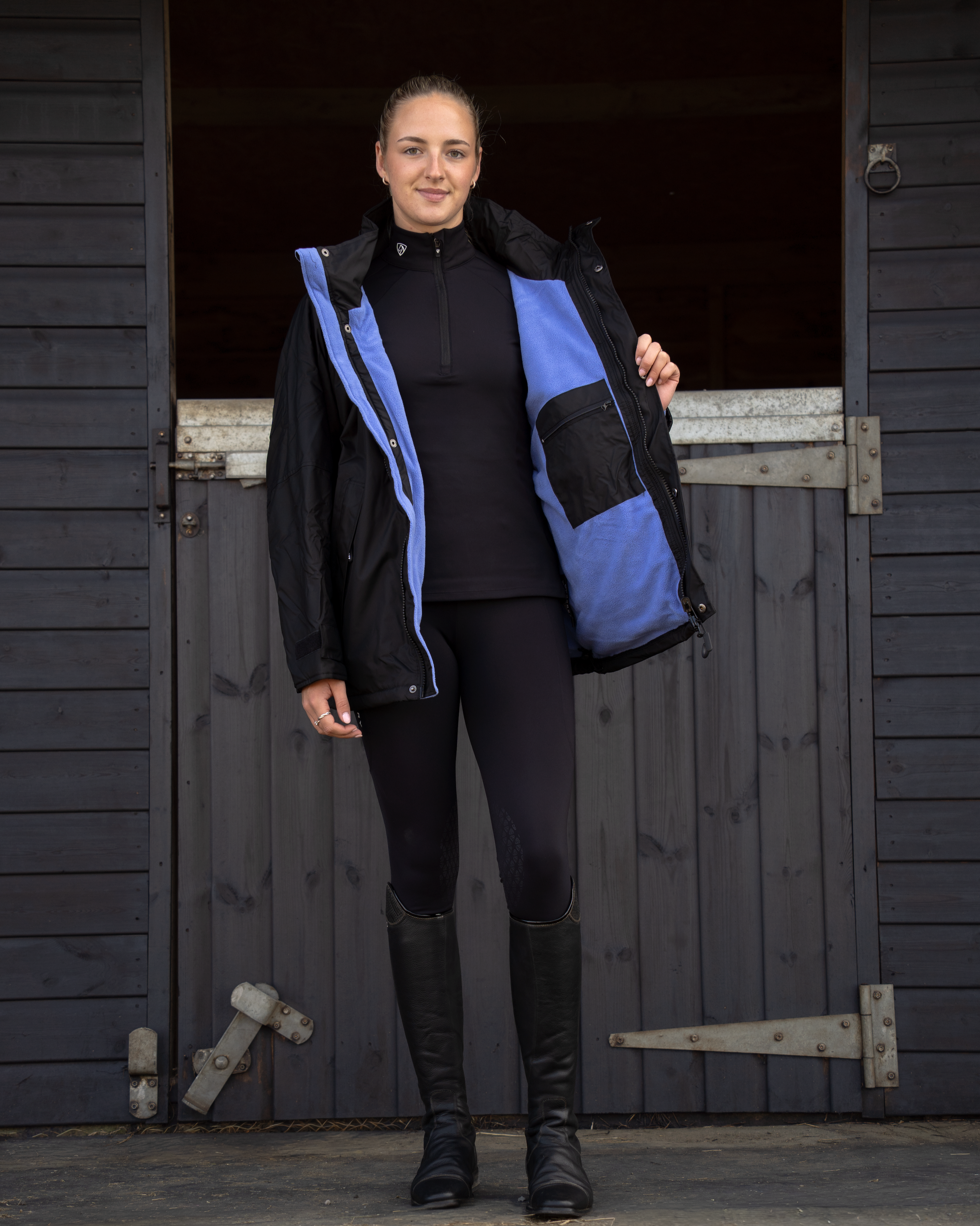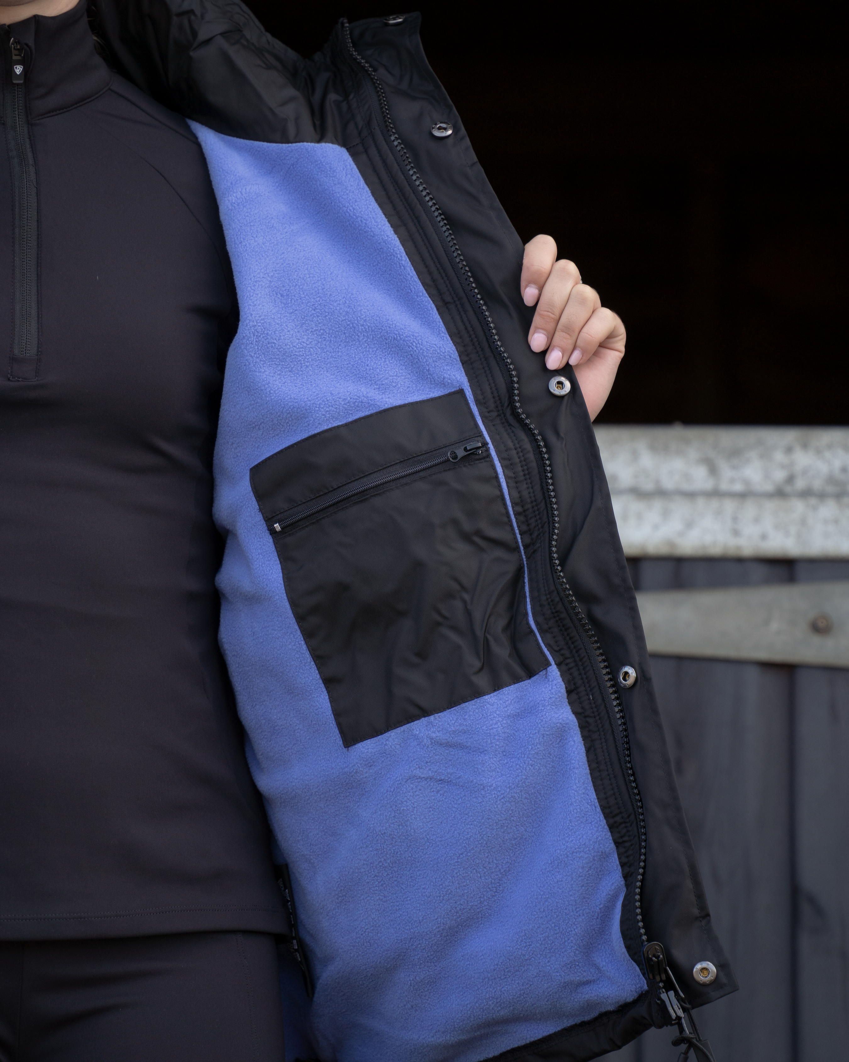 The adjustable stowaway hood is equipped with bungee toggles and a velcro strip for a customisable fit over most riding hats or a more conventional size when needed. When not required the hood stows away neatly in to the collar.